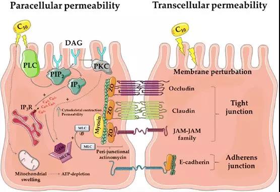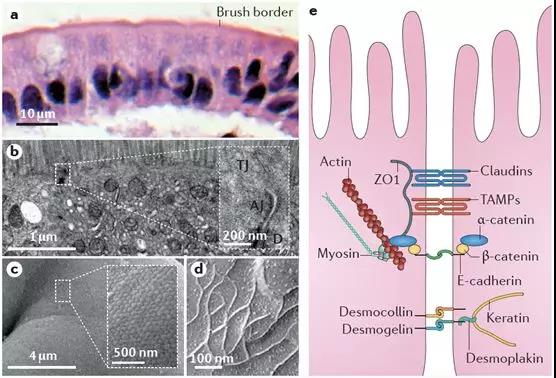 穿過粘液層後,即是腸粘膜上皮細胞的刷狀緣瞭(le)。從下圖的病理與電鏡圖片中可以看到,腸粘膜上皮細胞以單細胞層形式緊密排列,細胞與細胞之間則由緊密連接結構進行封閉。任何通過腸道被吸收的物質,都隻能通過腸粘膜上皮細胞或經細胞旁的緊密連接結構,吸收入粘膜下毛細血管或淋巴管網絡。盡管腸粘膜細胞刷狀緣細胞膜上分布著(zhe)大量轉運蛋白、離子通道等,既可以用來吸收腸腔内的水、電解質及營養物質,也可以向腸腔内分泌相關物質調節機體内穩态。但正如上文所述,無論是糖類、脂肪、還是蛋白質,都必須被分解爲最基本形式的單糖、脂肪酸及氨基酸後,才可以穿過腸粘膜屏障被吸收。由緊密連接、粘附鏈接及細胞橋粒所封閉的細胞旁通路,在正常生理情況下,僅可以與腸腔内物質進行水和電解質的交換。此外,構成緊密連接等細胞旁通路的相關蛋白功能一旦受損,将造成嚴重腹瀉等危險情況。