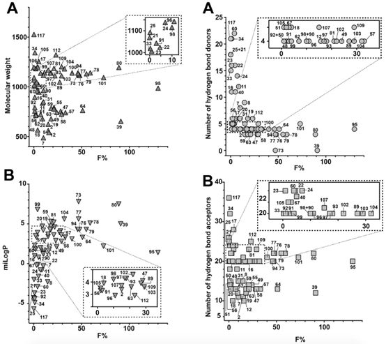 自Christopher Lipinski提出著名的“Rule of 5”(分子量小於500 Da、氫鍵供體少於5個、氫鍵受體少於10個、可旋轉鍵少於10個、脂水分配系數對數值在-2至5之間)理論之後,小分子藥物開發領域基本都嚴格遵循這一經典理論,但對於多肽及大分子生物藥物來說,則完全不可能滿足“Rule of 5”的所有要求。由於多肽分子普遍具有較高的極性、較大的極性表面積、大分子量、低脂溶性、高清除率、易降解等諸多缺點,口服多肽幾乎是不可能實現的給藥方式。然而,現實中也存在著(zhe)特例,例如臨床廣泛使用的環孢素及去氨加壓素這兩個天然大環肽分子,卻分别具有30%和0.17%的口服生物利用度。Daniel Nielsen等對125種具有不同口服生物利用度的天然環肽分子進行分析後總結到:對於環肽分子而言,分子量大小並(bìng)不是影響生物利用度的主要原因;與氫鍵受體數量相比,氫鍵供體對生物利用度的影響更大;至於可旋轉鍵問題,則可通過将肽鏈環化、增加分子剛性克服;而極性表面積在分析結果中並(bìng)未體現出關鍵作用。此外,肽鏈的環化有助於内化分子中的氫鍵、極性分子、以及酶切位點,可以有效降低分子極性、減少極性表面積、增加脂溶性與分子剛性,有助於增加多肽分子對細胞膜的滲透性。