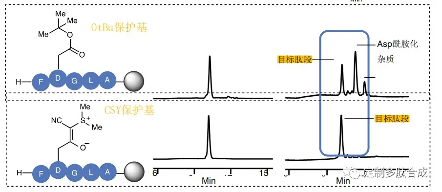目前多肽的合成技術已經很成熟,但是在多肽合成過程中有時會發生DG重排或者天冬氨酸酰胺化,導緻雜質峰離目标峰很貼近,而很難純化甚至無法分離。從而導緻産率降低,爲解決此類問題,今天介紹一種Asp的側鏈保護基,氰基亞硫酰基,簡稱CYS。此類方法可有效的減少DG重排和Asp酰胺化導緻的雜質,大大提高合成,純化效率。